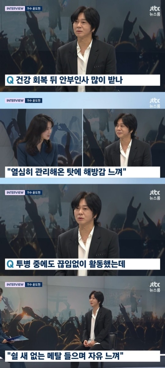 윤도현은 26일 종합편성채널 JTBC '뉴스룸' 인터뷰 코너에 출연해 "무대에서 건강하게 보이려고 관리를 열심히 했더니 더 건강해졌다"며 밝은 미소를 드러냈다.