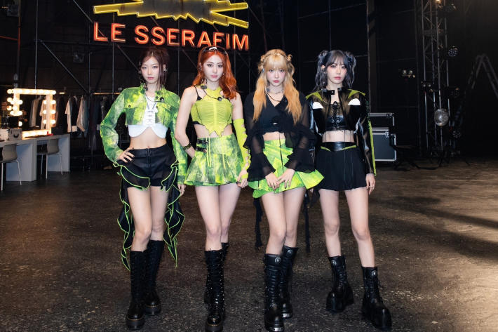 그룹 르세라핌이 미국 MTV '프레시 아웃 라이브' 현장에서 포즈를 취하고 있다. 쏘스뮤직 제공 © 제공: 노컷뉴스
