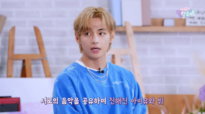 아이유는 "이분과 저의 접점은 어디서 생겼을까 궁금하신 분들도 많을 것 같다. 많은 분들이 어떻게 '팔레트'에 출연하게 됐을까 궁금해할 것 같다"라며 뷔를 소개했다.