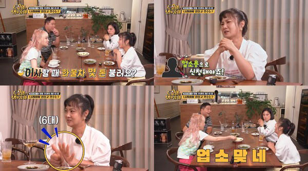 이에 히밥이 "(나래) 언니 이사할 때 몇 톤 화물차 불러야 해요?"라고 묻자, 박나래는 "많이 부르기도 하는데 저번에 이사 할 때 이삿짐센터 사장님이 '이건 가정집 이사로 신청하시면 안 된다. 업소용으로 신청하셔야 한다'고 하시더라"라고 답했다.