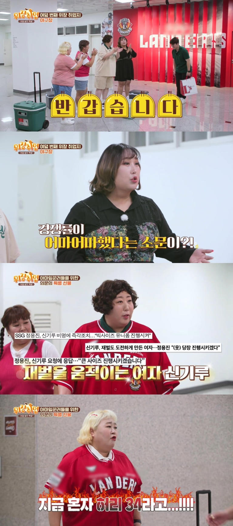 신기루는 감격에 겨워 바로 유니폼을 입어보면서 "최준석 선수 정도의 핏으로 제작하신 것 같다"라며 너스레를 떤다. 그러면서 "제가 재벌을 움직이는 여자라고 기사가 많이 났다"라며 자화자찬해 모두를 빵 터뜨린다. 반면 김민경은 등 번호가 34인 유니폼을 받았다. 이에 홍윤화는 "지금 혼자 허리 34라고 티 내는 거냐? 말라깽이 완전 싫다"라며 그라데이션 분노를 터뜨려 현장을 웃음바다로 만들었다는 후문이다.
