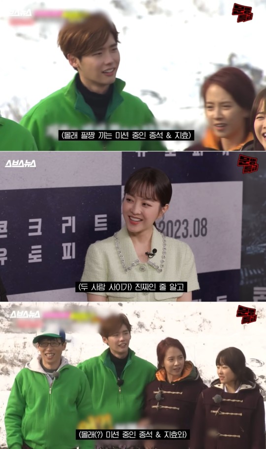 재재는 "당시 종석씨와 송지효씨가 몰래 팔짱을 끼는 미션이 있어서 몰래 해야 하는데 진짜인 줄 알더라"라고 운을 뗐다.