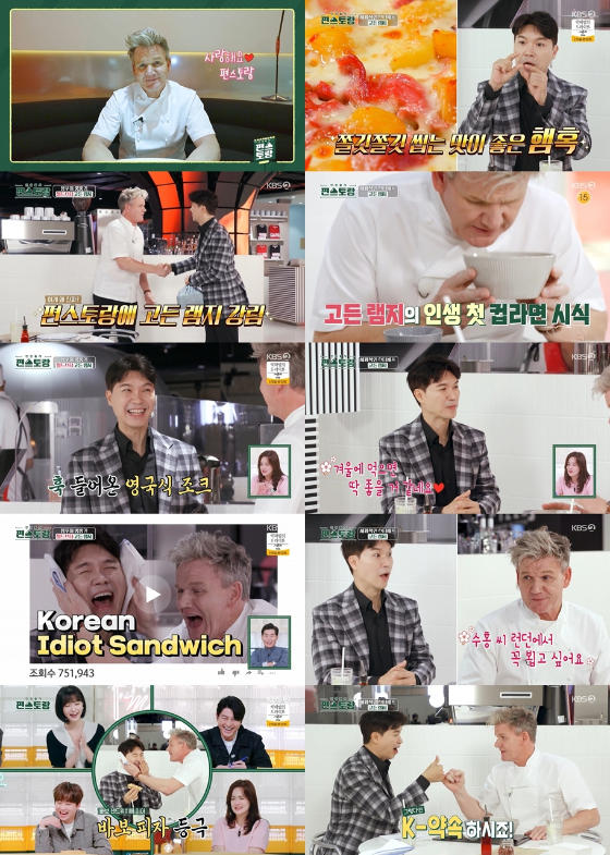 그런가 하면 고든램지도 박수홍의 메뉴를 맛봤다. 앞서 '편스토랑'에서 우승을 차지하며 출시된 얼큰설렁탕라면이었다. 지금까지 컵라면을 먹어본 적 없다는 고든램지는 망설임 없이 시식을 시작했다. "매운 거 좋아한다"라며 매운 수프까지 거침없이 털어 넣었다. 이에 모두 고든램지의 독설이 쏟아지는 것은 아닐지 조마조마한 마음으로 지켜봤다. 하지만 고든램지의 반응은 '호평'이었다.