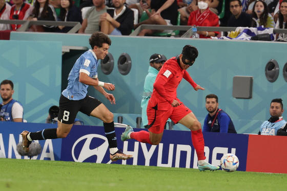 24일 오후(현지시간) 카타르 알라이얀 에듀케이션 시티 스타디움에서 열린 2022 카타르 월드컵 조별리그 H조 1차전 대한민국과 우루과이의 경기에서 손흥민이 드리블 돌파를 하고 있다. 2022.11.24/뉴스1 ⓒ News1 이광호 기자© 뉴스1
