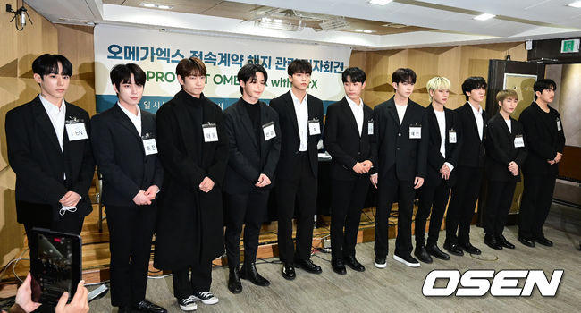 오메가엑스 멤버 11명과 법률 대리인 노종언, 서주연 변호사는 16일 오후 서울 서초구 변호사회관에서 ‘오메가엑스 전속계약 해지 관련 기자회견’을 진행했다.