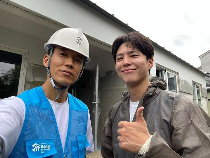 공개한 사진에서 션은 박보검과 함께 집짓기 봉사활동 현장에서 구슬땀을 흘렸다. 평소 두 사람은 절친한 사이로 봉사활동을 함께하는 것으로 유명하다.