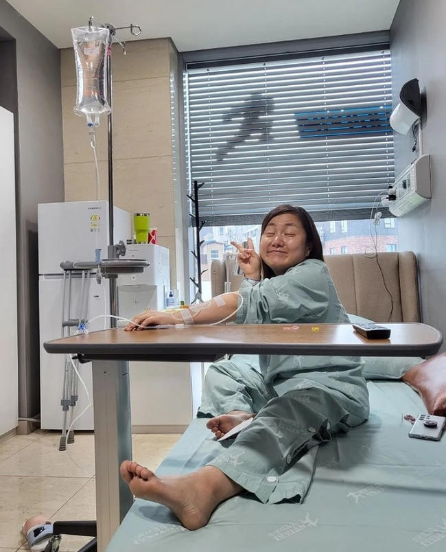 공개된 사진에는 수술을 앞두고 입원 중인 박나래의 모습이 담겨있다. 박나래는 해탈한 듯 카메라를 바라보며 브이 포즈를 취하고 있어 눈길을 끈다.