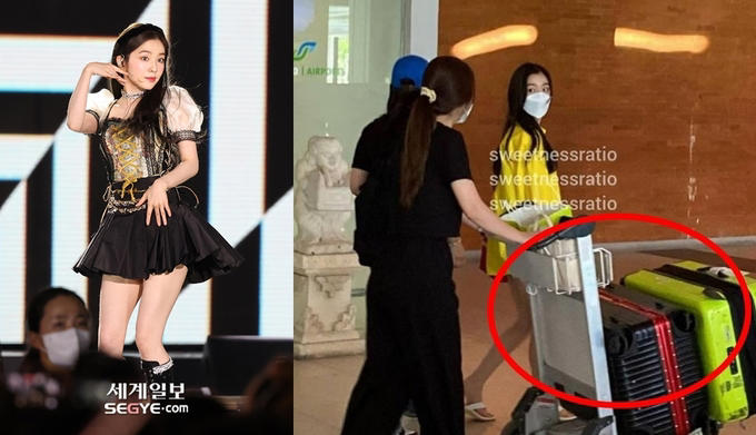 특히 아이린은 가방 하나를 어깨에 걸은 채 걷고 있었으며, 동행하고 있는 스태프는 짐이 가득 담긴 캐리어를 끌고 있다.