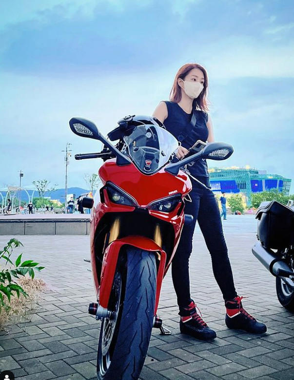 사진 속 오정연은 빨간색 오토바이 옆에서 포즈를 취하고 있다. 해당 제품은 2400만원이 넘는 고가의 오토바이로 알려져 화제가 됐다.