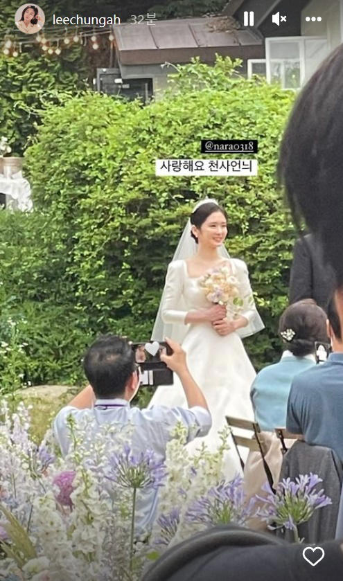 이날 이청아는 인스타그램에 "사랑해요 천사언니"라며 장나라의 사진을 공개했다. 푸른 나무숲을 배경으로 순백의 웨딩드레스를 입은 모습이 싱그러운 매력을 자아냈다.