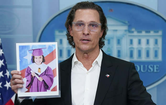 보통 대변인이나 미 정부 고위 당국자가 서는 백악관 브리핑룸 연단에 7일(현지시각) 할리우드 유명 배우 매슈 매코너헤이(52)가 섰다. 그의 고향은 아이 19명과 교사 2명의 목숨을 앗아가 미국 사회를 다시 큰 충격에 빠트린 초등학교 총격 사건의 무대인 텍사스주 유밸디다. 지난 한 주간 고향에서 아내와 함께 희생자 부모들을 위로했다는 그는 워싱턴으로 날아와 총기 규제를 호소했다.
