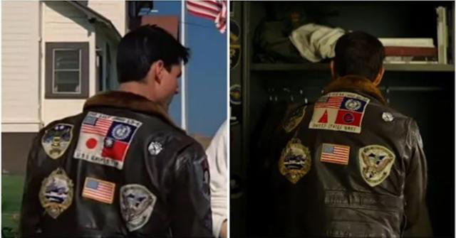 영화 ‘탑건: 매버릭’의 주인공 톰 크루즈가 입은 대만 국기와 일장기가 그려진 조종사 점퍼(왼쪽). 오른쪽은 예고 영상에서 나왔던 가상 국기가 그려진 점퍼. 트위터 캡처