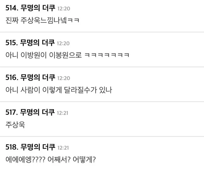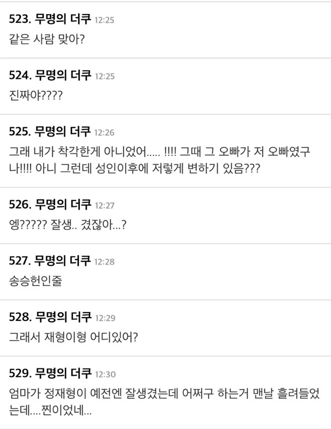 이에 누리꾼들은 충격이라는 반응을 보였다. 해당 댓글 창에는 “ㅋㅋㅋㅋ헐ㅋㅋㅋㅋㅋㅋ” “???????” "사람이 이렇게 달라질 수 있나" “세월이 야속하다” “같은 사람 맞아?” “그래서 재형이 형 어디 있어?” 등 댓글이 달렸다. 다음은 커뮤니티 더쿠의 댓글창 일부다.