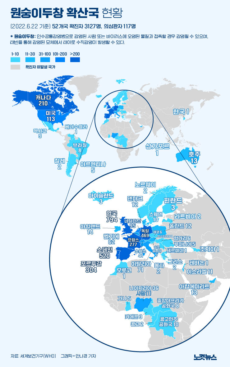 원숭이두창 확진자 발생국 현황 최고관리자 0 946 2022.06.24 01:28 원숭이두창 확진자는 22일 기준 52개국 3127여 명으로 집계됐다. 대다수는 유럽 지역에서 발병했다.