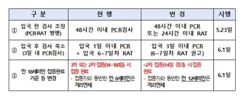 또 현재 입국 1일 이내에 실시하는 PCR 검사 시기는 6월 1일부터 '입국 후 1일에서 3일 이내'로 조정한다. 입국 6∼7일 RAT 의무도 '자가 신속항원검사 권고'로 변경한다.