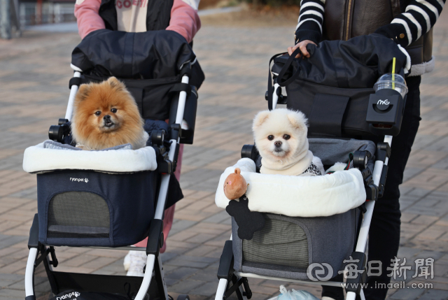 5일 시민들이 반려견용 유모차인 '개모차'에 강아지를 태워 산책을 하고 있다. 강아지 보호자들은 강아지 나이가 많거나