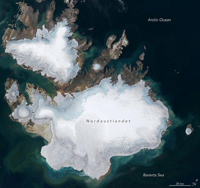 지난 15일(현지시간) 미 항공우주국(NASA) 지구관측소는 지구관측위성인 랜드샛8(Landsat8)에 장착된 OLI(Operational Land Imager)로 촬영한 스발바르 제도 노르아우스틀라네 섬 모습을 사진으로 공개했다.