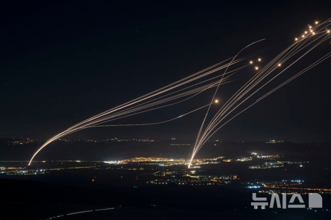 [갈릴리=AP/뉴시스]4일(현지시각) 이스라엘의 아이언돔 방공 시스템이 이스라엘 북부 갈릴리 지역에 대한 레바논 헤즈볼라의 로켓 공격을 방어하고 있다.
