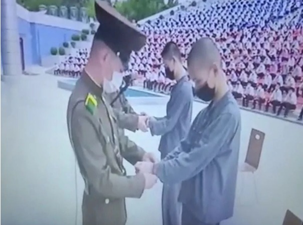 북한 당국이 남한 드라마를 봤다며 노동교화형 12년을 선고한 평양의 16세 소년들에게 수갑을 채우는 모습. /샌드연구소 영문뉴스레터