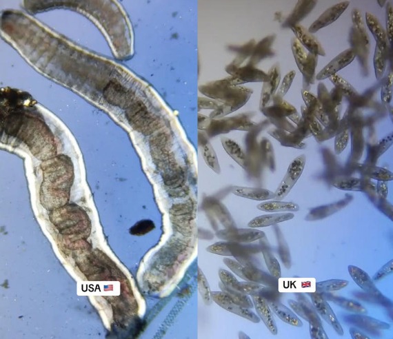 영상을 보면 현미경으로 관찰한 미국 수돗물에는 벌레처럼 보이는 유기체들이 확인된다. 영국 수돗물에서는 타원형 미생물 군집이 발견됐다. 영국의 수돗물이 미국에 비해 상대적으로 나아 보인다.