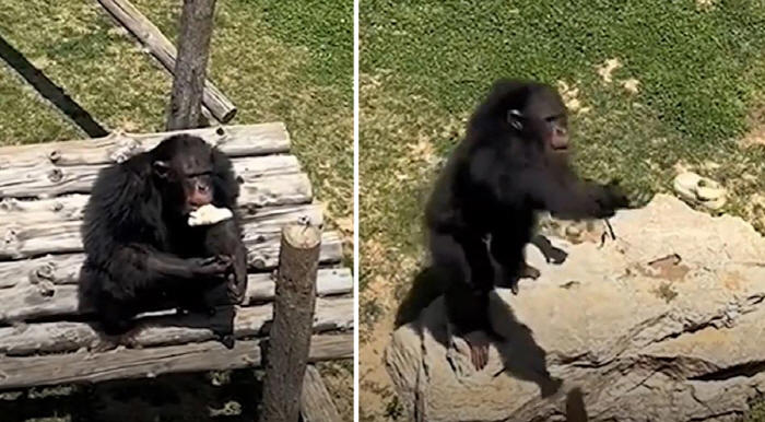 사육사가 빨리 신발을 던져 달라고 하자 침팬지는 난간 쪽으로 더 가까이 다가오더니 사람들이 있는 곳으로 신발을 던져 주었다.