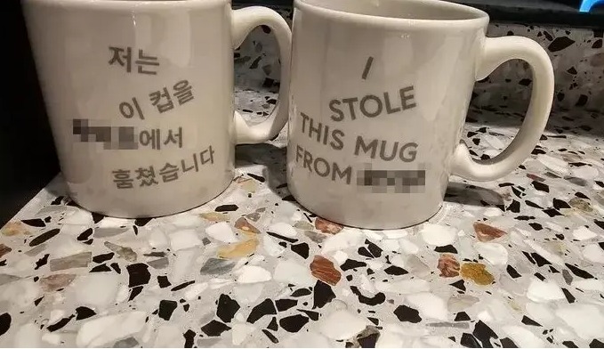 공개된 사진에 따르면 서울 소재 한 4성급 호텔 머그잔에는 "저는 이 컵을 OOO(호텔 이름)에서 훔쳤습니다"라는 문구가 한글과 영어로 기재되어 있다.