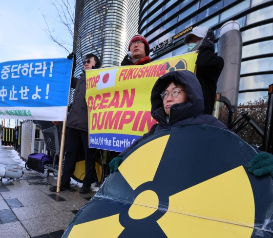 환경운동연합 활동가들이 서울 종로구 일본대사관 앞에서 기자회견을 열고 후쿠시마 오염수 해양투기 중단을 촉구하고 있다. [연합]