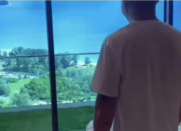 영상을 보면 거실 창 밖으로 시원한 바다 전경이 펼쳐지는데, 이는 실제 바다가 아닌 바다 전경을 담은 벽지였다.