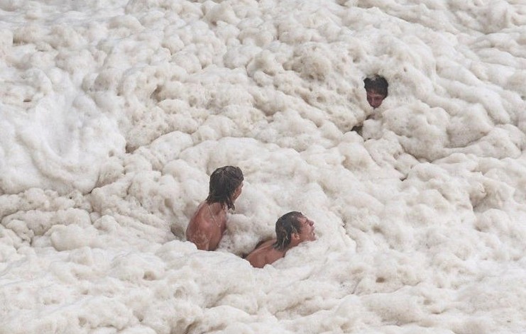 현재 인스타그램, 틱톡 등 사회관계망서비스(SNS)에는 풍성한 흰색 거품이 출렁거리는 모습, 주민·관광객들이 두꺼운 거품을 헤치며 헤엄치는 모습 등이 잇따라 올라오고 있다.