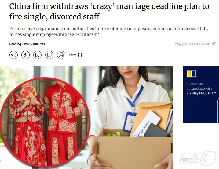 중국에서 독신과 이혼 사원에게 결혼 마감 시한을 제시한 뒤 이를 지키지 못할 경우, 해고하겠다고 협박한 최고경영자(CEO)가 당국의 경고를 받았다고 사우스차이나모닝포스트(SCMP)가 24일 보도했다.