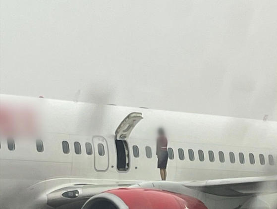 국내 한 항공사 승무원 비행기 날개 위 올라가 사진 찍는 모습