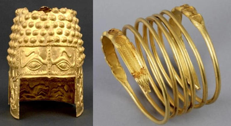 루마니아가 네덜란드 박물관에 빌려줬다가 도난당한 유물들. 황금 코토페네슈티 투구(왼쪽)와 황금 팔찌. AP연합뉴스