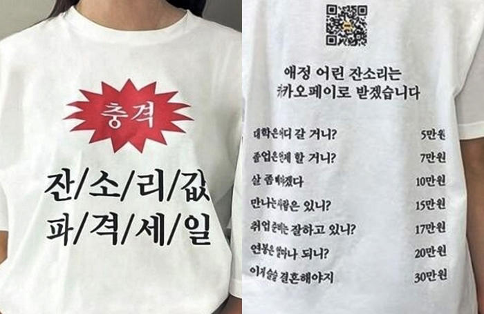 한편 명절 때마다 금지어가 되는 ‘결혼과 취업’ 잔소리에는 벌금도 구체적으로 매겨졌다. 잔소리 벌금 액수를 적은 티셔츠도 나왔다.