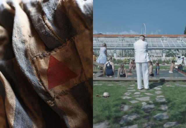 루돌프 회스의 저택에서 발견된 줄무늬 수용복(왼쪽), 회스 가족의 이야기를 다룬 영화 ‘존 오브 인터레스트’의 한 장면. EPA연합