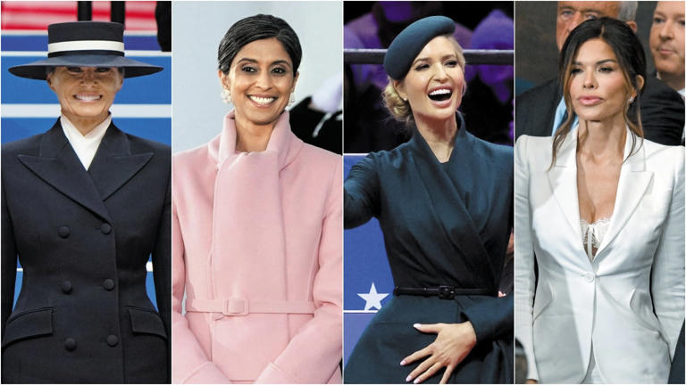 대통령 배우자 멜라니아 트럼프, 축제 분위기처럼 화사한 코트를 입은 부통령 배우자 우샤 밴스, 짙은 녹색을 세련되게 연출한 대통령 장녀 이방카 트럼프,