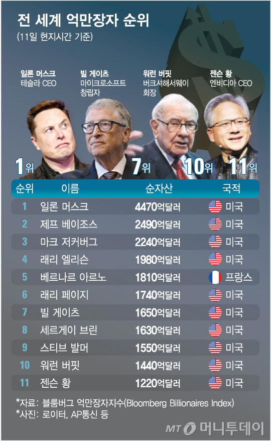 한편 블룸버그 억만장자 지수 3위에는 순자산 2240억달러(약 320조9696억원)를 소유한 마크 저커버그 메타 CEO가 이름을 올렸다. 워런 버핏 버크셔해서웨이 회장과 젠슨 황 엔비디아 CEO는 각각 10위와 11위를 차지했다.