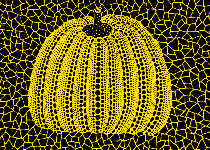 1호 크기로 원화인 '노란색 호박' 은 검정색과 노란색의 강렬한 대비가 눈에 띄는 쿠사마의 대표작이다. 반복적으로 등장하는 점은 쿠사마가 어릴 적 환각 속에 보았던 시각적 경험에서 비롯되었고, 이 패턴은 무한성과 자기 몰입을 상징하는 동시에 작품에 리듬감을 주고 있다.