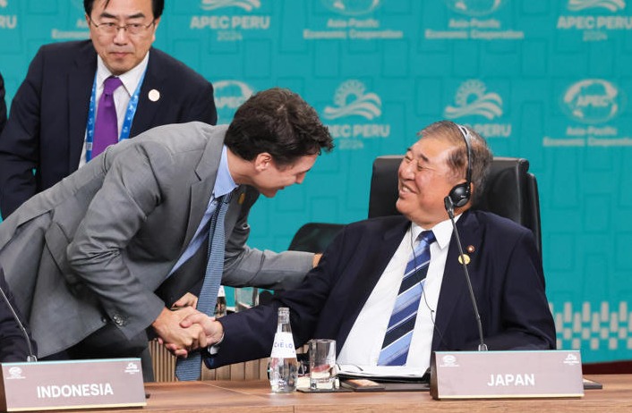 지난 15일 열린 APEC 정상회의에서 인사하는 이시바 일본 총리와 쥐스탱 트뤼도 캐나다 총리.