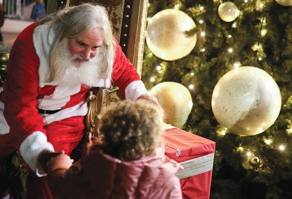 한 산타 복장의 남성이 크리스마스 트리 앞에서 어린이를 반기고 있는 모습. [로이터]