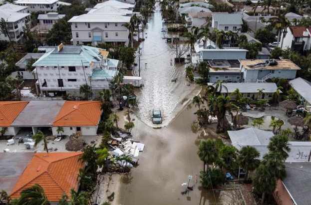 허리케인 밀턴이 북미를 강타한 이튿날인 지난달 10일 미국 플로리다주에 위치한 섬 시에스타 키에서 차량 한 대가 침수된 도로를 지나고 있다. 시에스타 키=AFP 연합뉴스