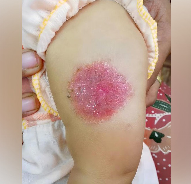 몇일 후 카디프 보건위원회의 소아과전문의가 방문 아동보호 의료서비스를 실시했고 아기의 멍 안에 1.5cm 크기의 더 진한 멍이 생겨 있음을 확인했다.