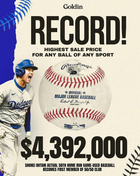 [뉴시스] 홈런공 경매 역대 최고액 신기록 작성한 오타니 쇼헤이의 시즌 50호 홈런공. (사진 = 골딘 옥션 공식 X 캡처) © 뉴시스