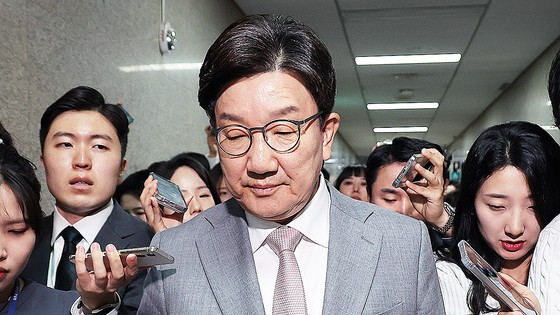 취재진의 질문을 받고 있다. 권 원내대표는 이날 자진 사퇴 의사를 밝혔다. 연합뉴스