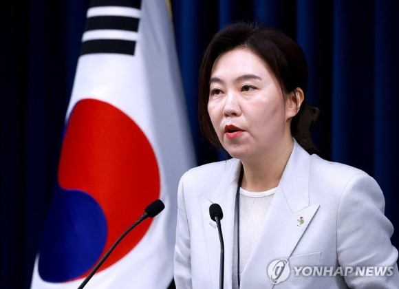 (연합뉴스) 홍해인 기자 = 강유정 청와대 대변인이 9일 서울 용산 대통령실 청사에서 대통령경호처 인사 관련 현안 브리핑을 하고 있다. 2025.6.9