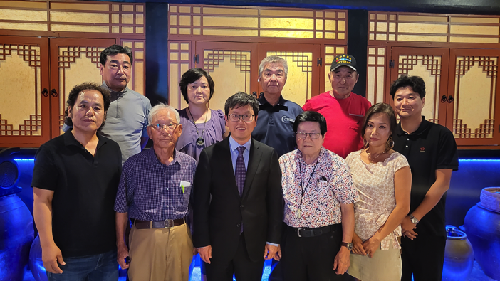 새크라멘토 한인사회는 한국으로 이임하는 정광용 부총영사를 환송하는 송별회를 개최했다. 사진 앞줄 오른쪽부터 시계 방향으로 이호석, 김영숙, 변청광, 정광용, 강현진, 조현포, 최영준, 이모나, 김요한, 박상운.
