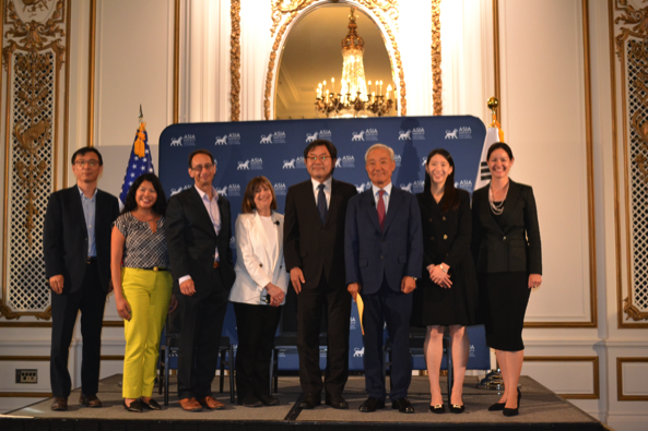 18일 SF총영사관과 아시아소사이어티 북가주지회가 공동주최한 한미 자유무역협정(FTA) 발효 10주년 기념 세미나에서 패널과 주요 참석자들이 기념촬영을 하고 있다. 왼쪽 3번째부터 제임스 그린 세미나 진행자, 웬디 커틀러 전 USTR 부대표, 윤상수 SF총영사, 김종훈 전 통상교섭본부장, 윤홍선 영사, 마가렛 콘리 아시아소사이어티 북가주지회 디렉터