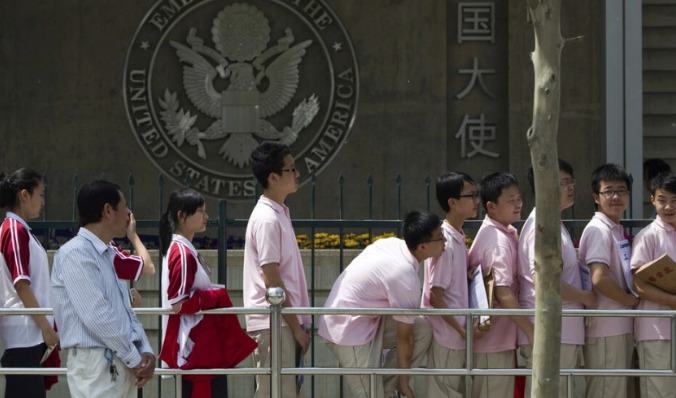 중국 베이징 미국 대사관 앞에서 중국 학생들이 비자 면접을 위해 기다리고 있다. 사진 AP 연합뉴스
