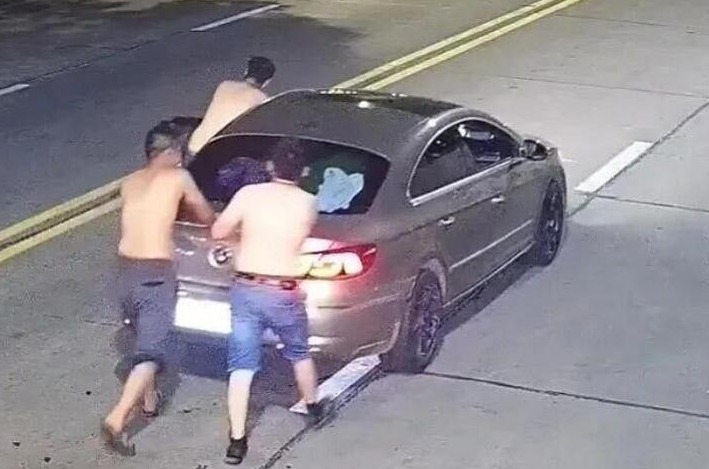 영상에는 웃통을 벗은 세 남성이 소형차를 밀고 가는 모습이 담겼다. 한 남성은 차량 조수석 옆에서 핸들을 잡고 있으며 나머지 두 명이 뒤에서 차량을 밀고 있다. 이들은 차를 30분가량 밀며 500m 정도 이동한 뒤 인근 정비소 앞에 차량을 멈췄다.