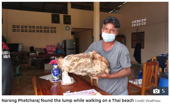 영국 더선은 태국 어부 나롱 펫차라지가 지난달 27일 태국 남부 니욤 해안에서 해변에 떠내려온 용연향을 발견했다고 5일(현지시간) 보도했다.