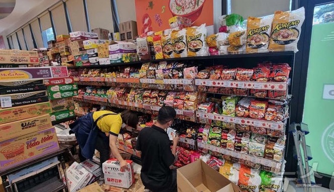 베트남 하노이 후지마트에서 직원들이 한국 라면을 매대에 채워넣고 있다. / 뉴스1